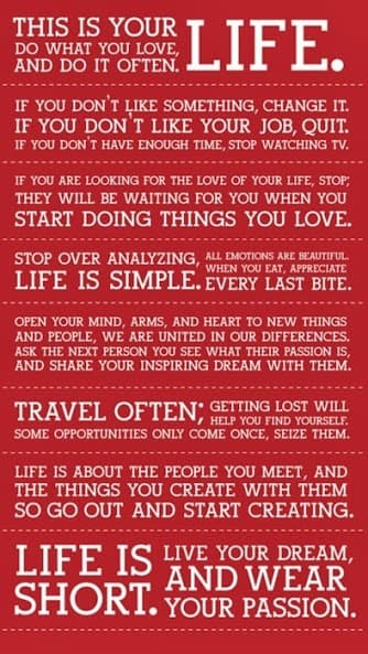 Do what you love, and do it often. Life is short for you to live on someone else's life. Of course, quitting your job without a plan isn't wise, but overall, agree with this. Be happy and contented in the long run. That's life, and your life matters.